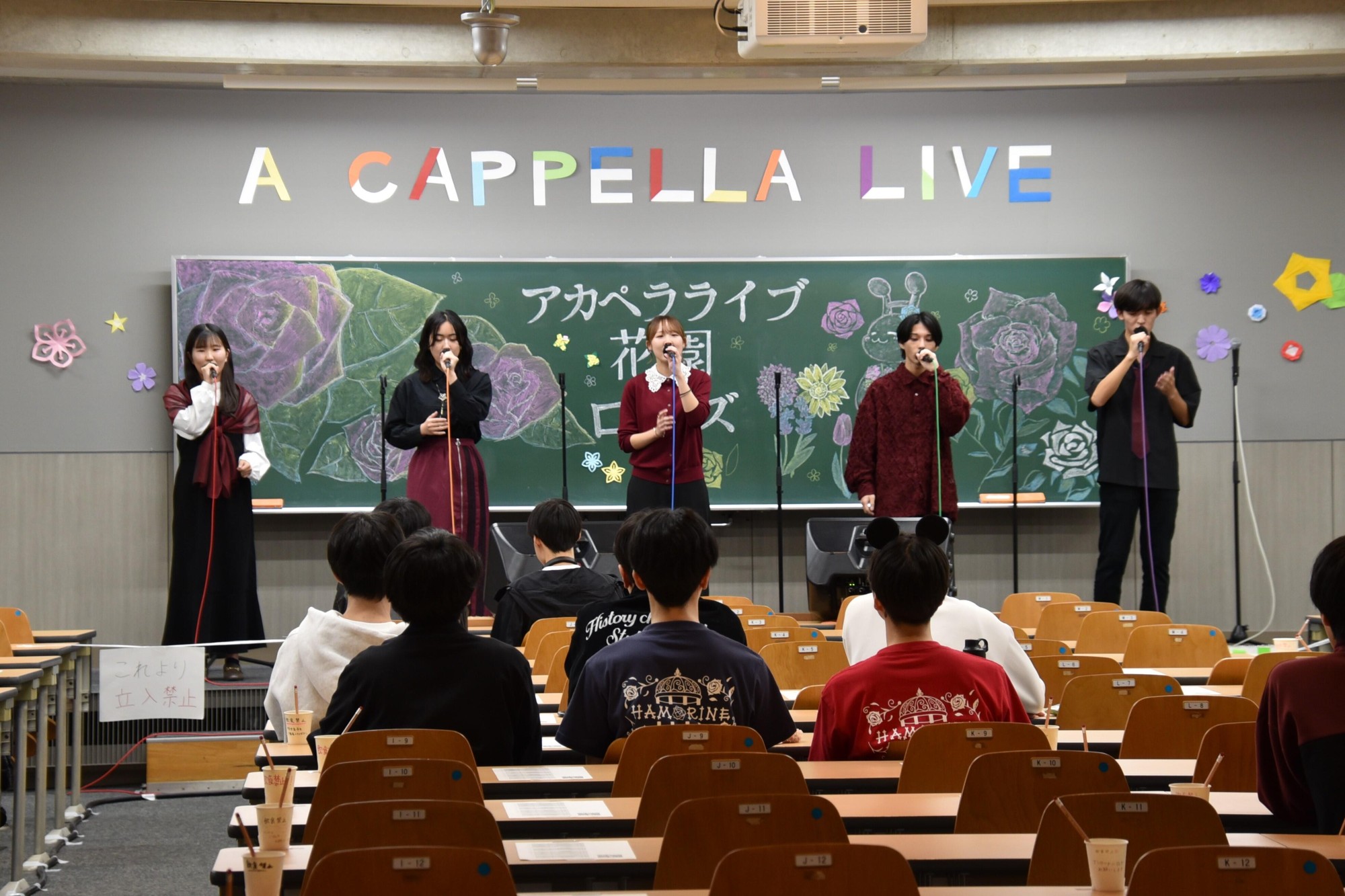 天白キャンパスでは、共通講義棟北前やグリーンパーク前などのステージの周囲に常に人だかりができる盛況ぶりで、ダンスパフォーマンスやチアリーディング部のステージなどが人気を集めました。また、ギターマンドリン合奏団とGAKUMUBANDによる記念演奏会では飯島澄男終身教授も登場し、フルートの爽やかな軽やかな音色を響かせていました。