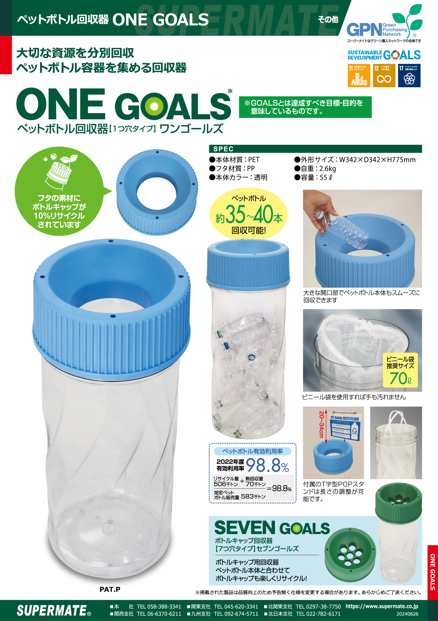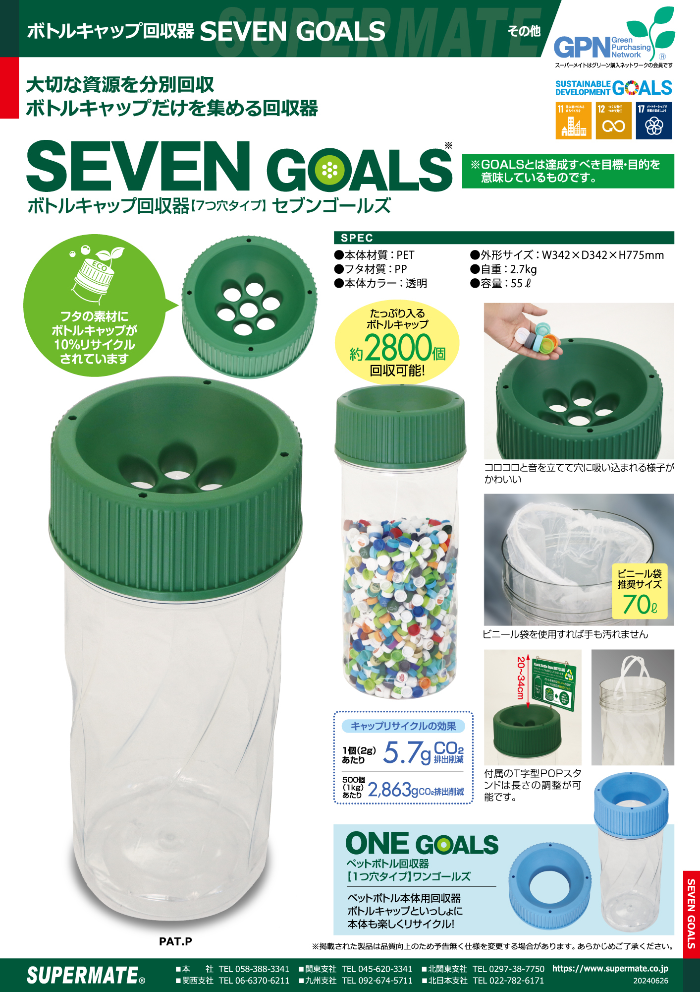 株式会社スーパーメイト(本社:岐阜県羽島郡笠松町、代表取締役社長:山下 智則)は、ペットボトルのキャップをリサイクル資源として回収するボトルキャップ専用回収器『セブンゴールズ(SEVEN GOALS)』を、2024年7月3日に発売いたします。
