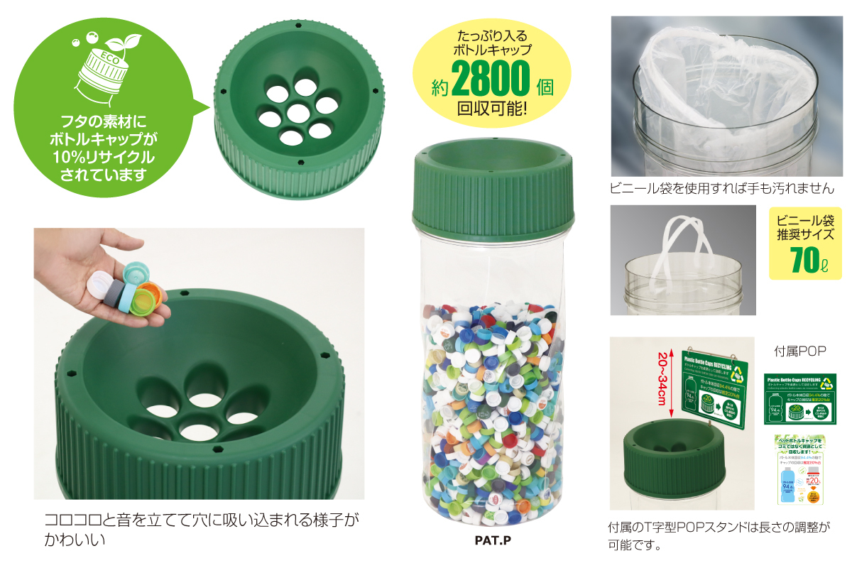 ボトルキャップを約2,800個投入できる容量となっており、デザインだけではなく機能面でも工夫された回収器です。