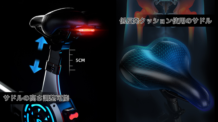 高さ調整可能なサドルは柔らかいクッションを使用しているので、長時間乗っても負担が少ないように設計しています。