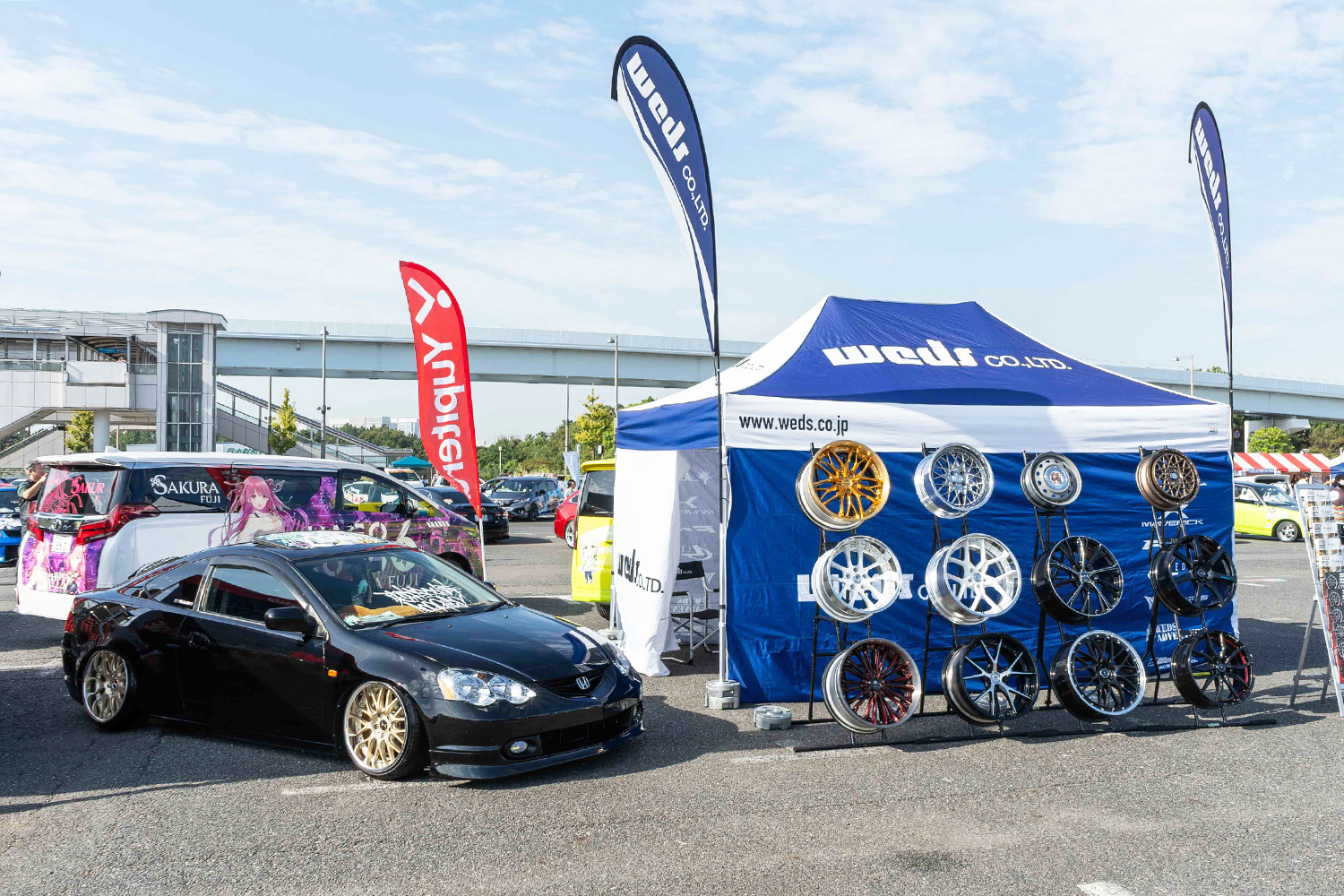 痛車制作SHOPのデモ車展示やステッカー・グッズ販売。その他にも、ホイールやケミカルといったカー用品、アパレルや関連グッズなどの即売会も開催。