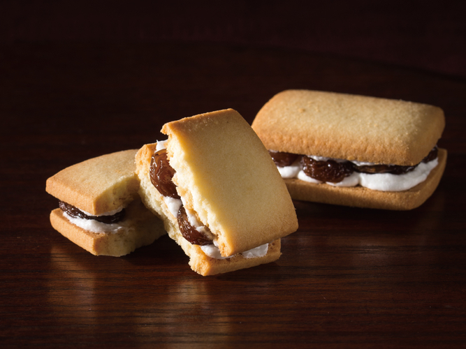 この電氣ブランで漬けたレーズンをサンドした至福の逸品。