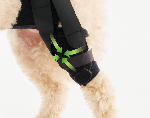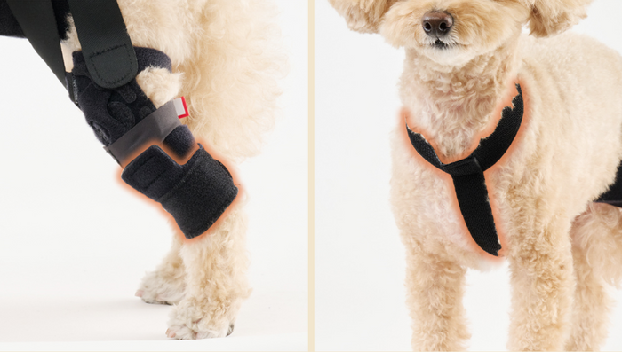 様々な犬種や体型のわんちゃんの膝に対応できるよう、オプションパーツを2つ追加しました。オプションパーツを活用することで、オーダーメイドで作成しなくてもぴったりと装着できるようになりました。