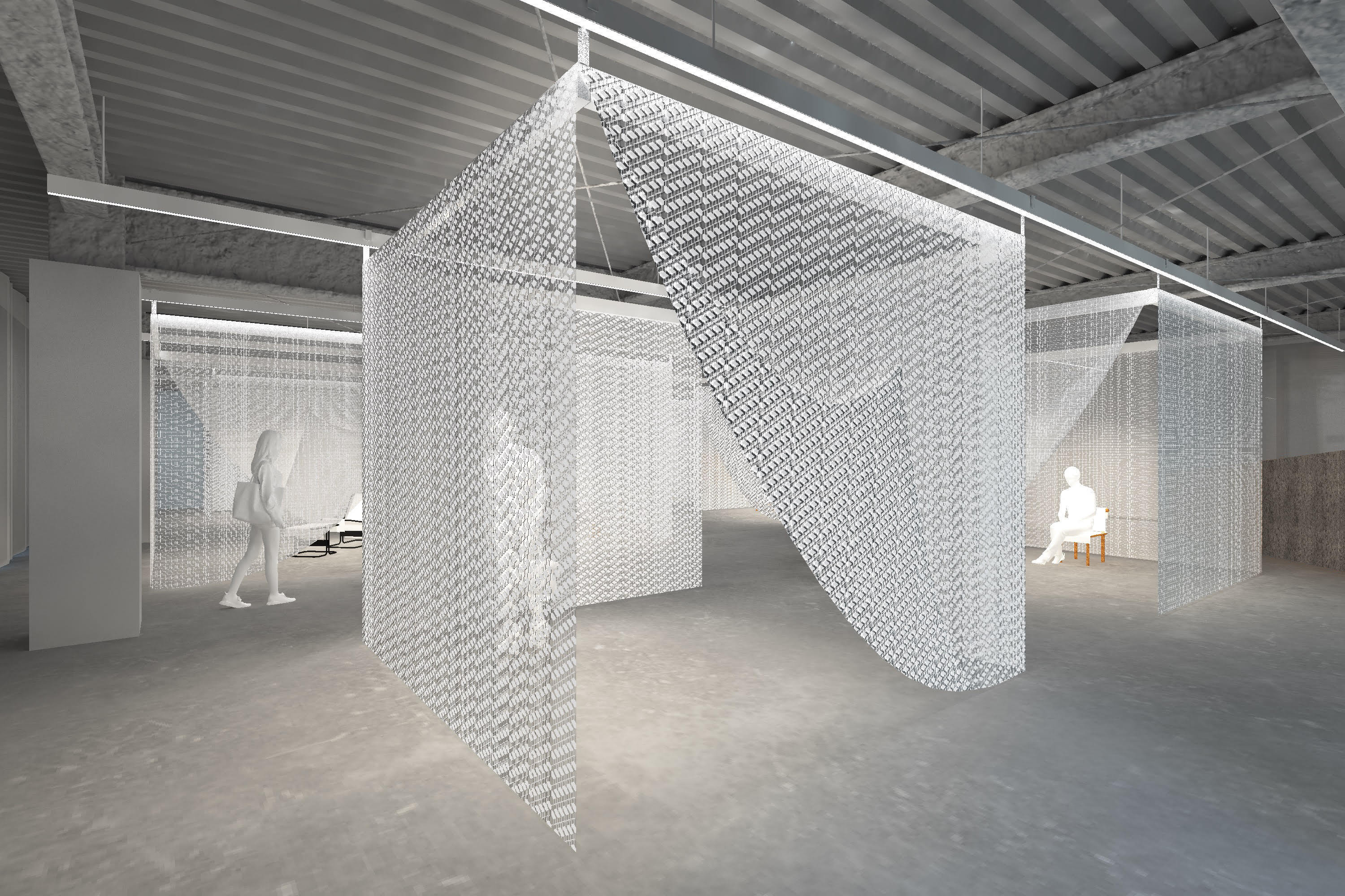 本展はこうして誕生したPAGES CHAIR×NUNOに、触れて、めくって、おすわりいただける体感型の展覧会です。会場を構成する布は、本展にあわせて須藤とNUNOのメンバーが新たにデザインしたもので、家具と布、空間がシンクロする展示空間は、インスタレーション作品としてもお楽しみいただけます。来場者の心を躍らせる空間デザインはたしろまさふみが担当しました。