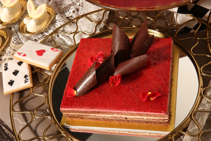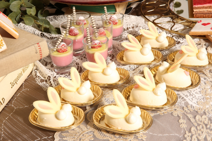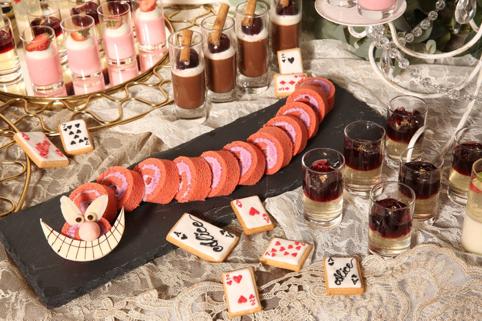 白うさぎをイメージしたムースや、不気味な笑いのチェシャ猫のロールケーキ、いちごをふんだんに使用したタルトやティラミス、モンブラン、シフォンケーキなどのスイーツに加え、ビーフカレーやスープなどの軽食もご用意。ウエディングパティシエが作る特製スイーツと軽食を心ゆくまでご堪能いただけます。まるで、アリスとともに不思議の国のお茶会に招かれたかのような特別な時間をお過ごしください。