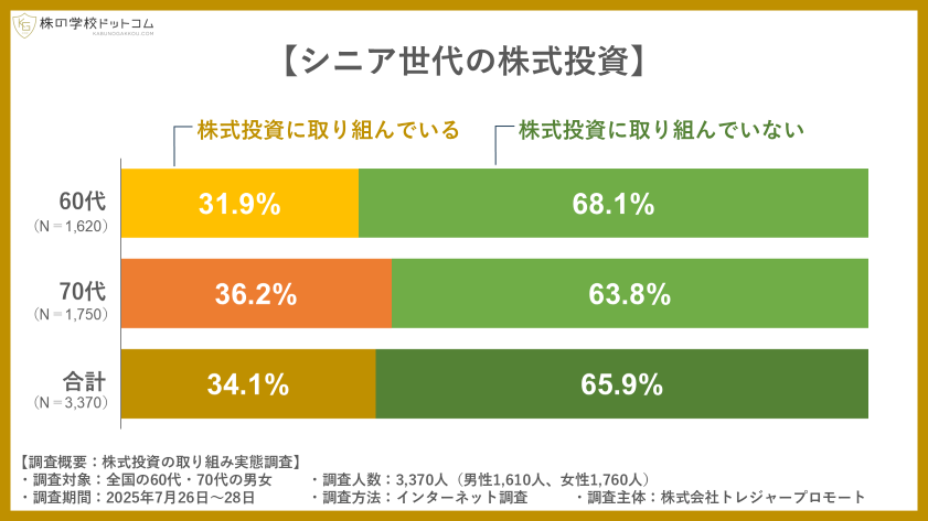 60・70代のシニア世代は、どれくらい株式投資に取り組んでいるのでしょうか? 今回の調査結果によると、60代(1,620人)のうち31.9%、70代(1,750人)では36.2%が「株式投資に取り組んでいる」と回答しました。シニア世代全体としては34.1%になり、全世代平均の28.8%を大きく上回っています。