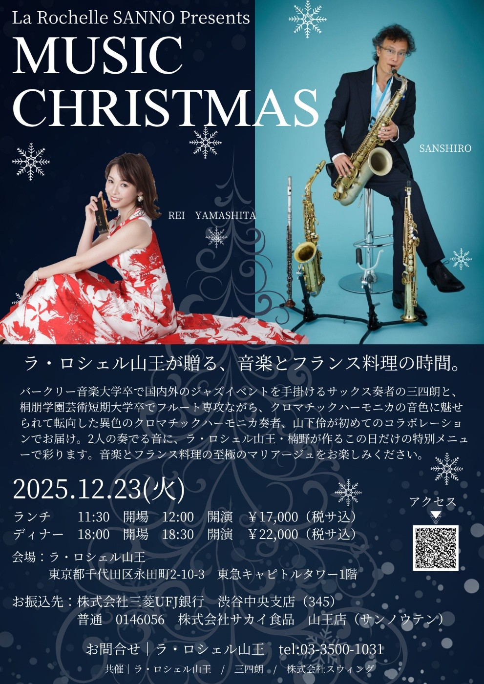 フランス料理店 ラ・ロシェルを運営する 株式会社サカイ食品(本社:東京都渋谷区、代表:坂井慎吾)は、12月23日に溜池山王に構えるフランス料理店、ラ・ロシェル山王店(料理長・楠野 大)にて、世界的サックス奏者の三四朗氏とコンテスト3部門優勝の実力を持つクロマチックハーモニカ奏者の山下怜氏を迎え、一夜限りのライブレストランを開催します。【公式HP】https://www.la-rochelle.co.jp/shop/sanno/