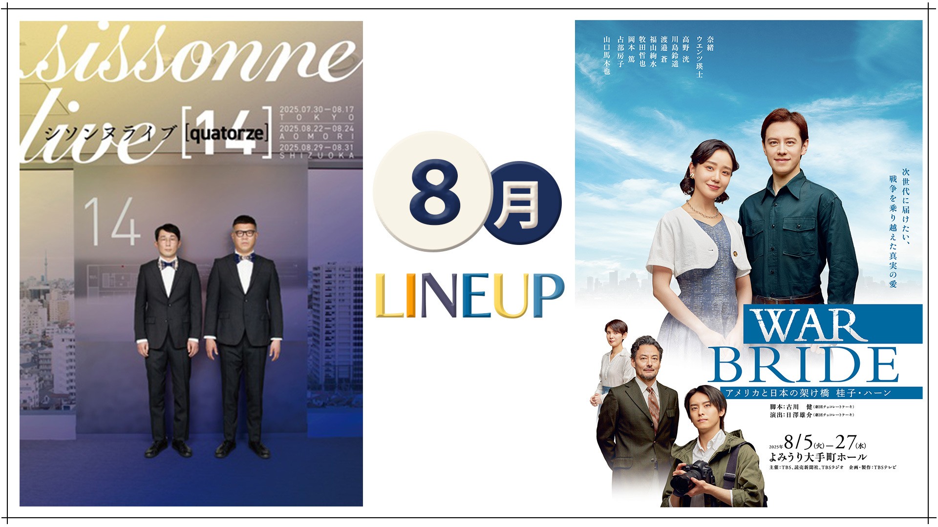 8月には、2013年にスタートし、今回が14回目の開催となるシソンヌライブ[quatorze](下北沢)、連合国軍占領下の日本からアメリカへ渡った実在の女性の物語を奈緒、ウエンツ瑛士らが演じる舞台「WAR BRIDE」(大手町)など、関東近郊で開催される多様なジャンルの舞台公演が予定されています。