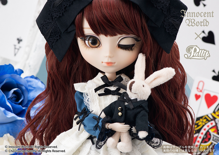 今回はブランドで大人気の「大人アリスシリーズ」のお洋服をドールサイズで再現!華やかなアリススタイルのドレスを着た、無邪気で可愛いプーリップが誕生しました。 目を惹く大きなリボンが可愛いヘッドドレスに、レースやフリルをふんだんにあしらったエプロン、深いブルーに黒のレースとリボンが上品なワンピースドレス、それぞれの衣装は可愛らしさの中に、少し大人びたクラシカルで上品な雰囲気が特徴です。 うさぎのぬいぐるみが可愛いドールサイズのポシェットを肩から下げれば、たちまちInnocent Worldらしい大人アリスの世界が広がります。