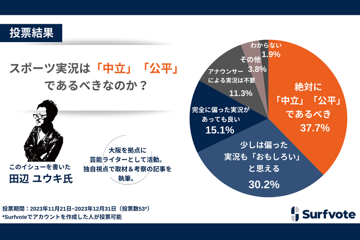 スポーツ実況は「中立」「公平」であるべきなのか?昨年のシーズン終盤に話題となった「アナウンサーの実況」踏まえ、Surfvote参加者の約半数が偏った実況も「おもしろい」「あっても良い」と回答。 大阪を拠点に芸能ライターとして活動する田辺ユウキ氏が「社会課題を解決するプラットフォーム『Surfvote』」でスポーツ実況の中立性についてとい、投票結果を公開! Polimill株式会社 2024-01-11 07:00 SNSとテクノロジーで社会課題の発見・解決をサポートするPolimill株式会社(ポリミル、本社:東京都港区、代表取締役:横田えり、以下Polimill社)はこのたび、「日本シリーズで物議を醸したアナウンサーの実況。スポーツ実況は「中立」「公平」であるべきなのか?」というイシュー(課題)について12月31日に投票が終了しましたので結果をお知らせします。 ジャンル: スポーツ ネット・IT 調査 タグ: スポーツ実況 中立 公平 アナウンサー 画像一覧 一括ダウンロード