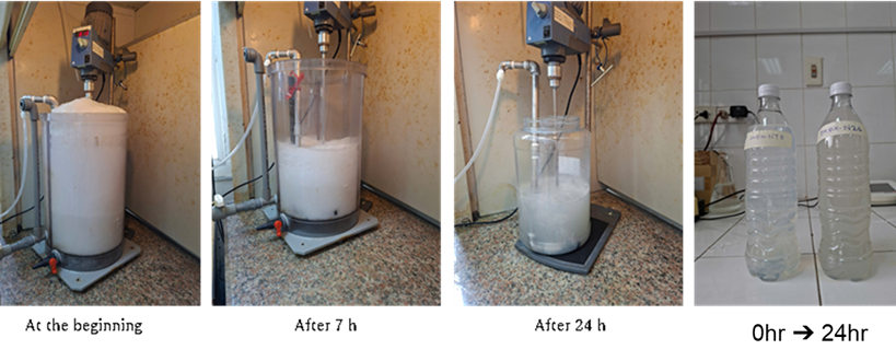 色処理薬剤費用が処理関連コストの7割近くになっており、また処理水槽・生物処理槽の設置面積も大きい。ランニングコストと汚泥処理費用削減、処理設備のコンパクト化が可能なら、すぐにでも導入したい、と非常に積極的に協力していただいています。