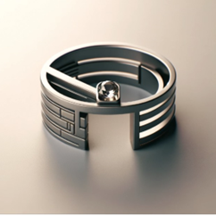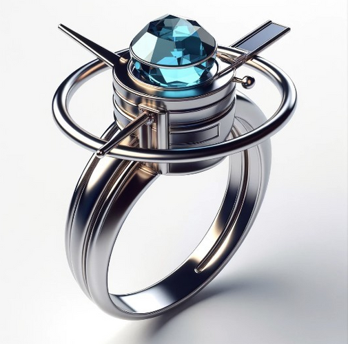 衛星にインスピレーションを受けたシンプルでありながら近未来な指輪のデザインです。指輪はミニマリストスタイルに未来的な要素を取り入れ、中央の宝石が特徴的な役割を果たしています。デザインには、衛星を想起させる要素、例えば軌道形状、すっきりとした金属表面、通信や探索を示唆するデザインなどが繊細に取り入れられています