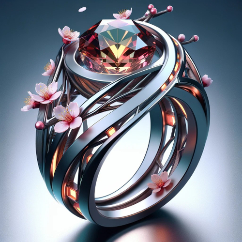 桜をモチーフにした近未来的な指輪のデザインです。桜の花びら、枝を取り入れ、桜の繊細な美しさを現代的なスタイルで表現しています。宝石は桜の花の色合いを反映し、全体のデザインにシームレスに溶け込んでいます。指輪はモダンで滑らかなラインを特徴とし、独特で先進的な美学を持っています。