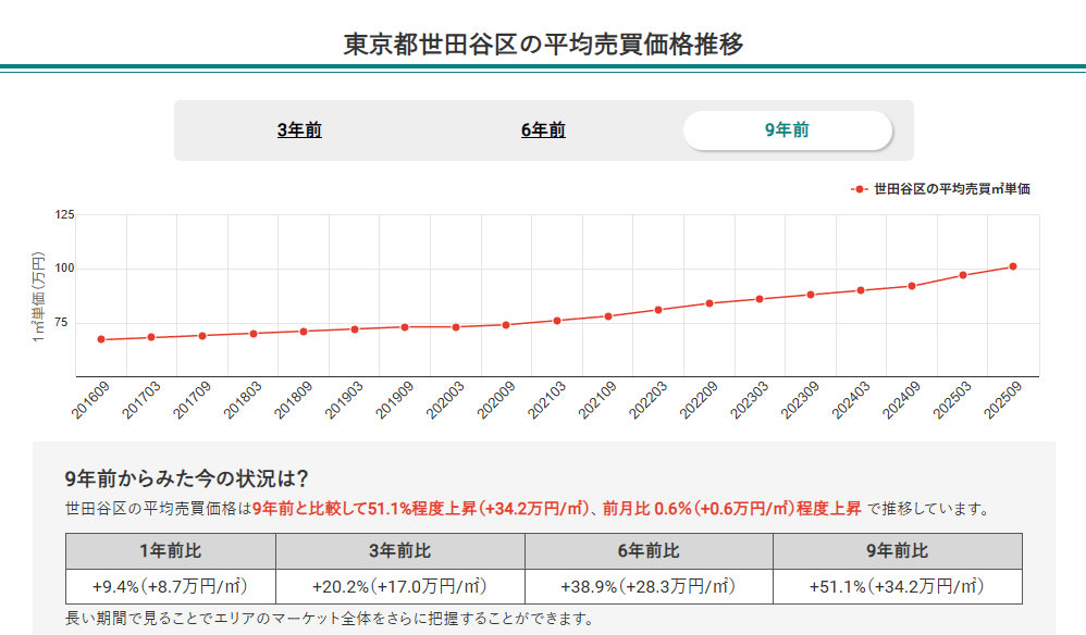 2025年9月時点での東京都全体の中古マンション平均売買平米単価は107万円で、9年前と比べて約67%上昇しています。