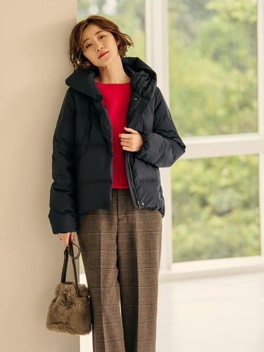 ショート丈の「つつまれダウン」は、首回りの華やかさを追求したボリュームネックデザイン。