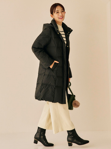 ロング丈の「つつまれダウン」は、防寒性と機能性を重視したフードデザイン。