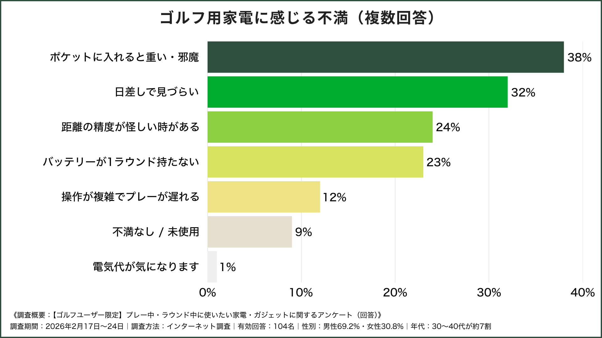 暑さ対策の家電が並ぶ中で、グリップヒーター/電子カイロが11.5%という数字は、単純に「小さい」とは言えません。選択肢として提示されたときにこの割合が出るということは、「困っていたが、解決策を探していなかった」ニーズが潜んでいることを意味します。現在のゴルフ市場に、手元を専用で温めるプロダクトがほとんど存在していないことが、この数字の背景にあると考えられます。