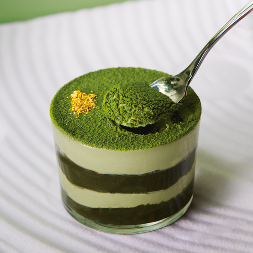 コクのあるマスカルポーネに香り高い抹茶を混ぜ合わせたクリームと、当店で提供するお抹茶の約5倍の抹茶を使った超濃厚な抹茶シロップが染み込んだスポンジを重ね合わせています。抹茶シロップにラム酒をふわっと香らせることで、上品な甘さと抹茶本来の旨みや苦みが引き立つ、お茶専門カフェならではの抹茶スイーツを愉しめます。