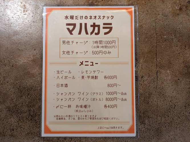 本業では株式投資や自社不動産の賃貸経営を手掛ける店主が、このたび中目黒にてスナック「水だけのネオスナック マハカラ」をオープンいたしました。
