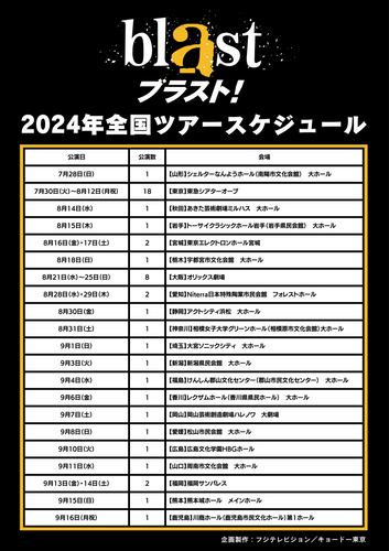 今夏10年ぶりに来日する『blast ブラスト!』(企画製作:フジテレビジョン/キョードー東京)の全国ツアースケジュールが決定いたしました。7月28日(日)から9月16日(月祝)の約1ヶ月半をかけて全国21会場をめぐります。なお、2月10日(土)10:00から、全公演対象の最速先行販売(先着)をチケットぴあにて開始いたします。
