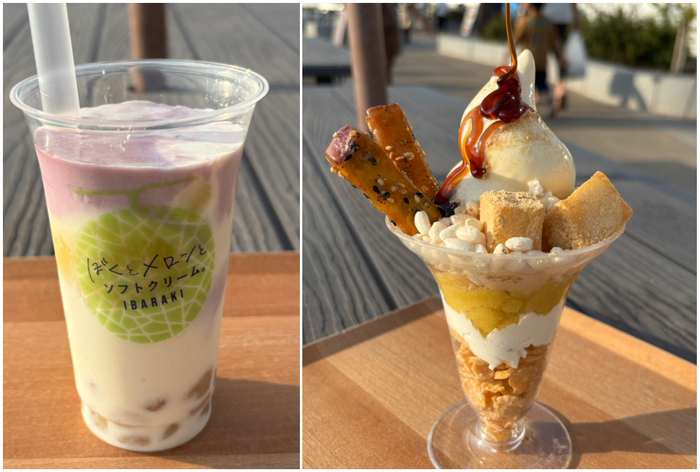 さつまいもの優しい甘みと道の駅で人気のミルクソフトを合わせた、とっても濃厚なシェイク。中には焼き芋味のわらび餅が入っていて飲んでも食べても楽しいおいもシェイクとなっております。