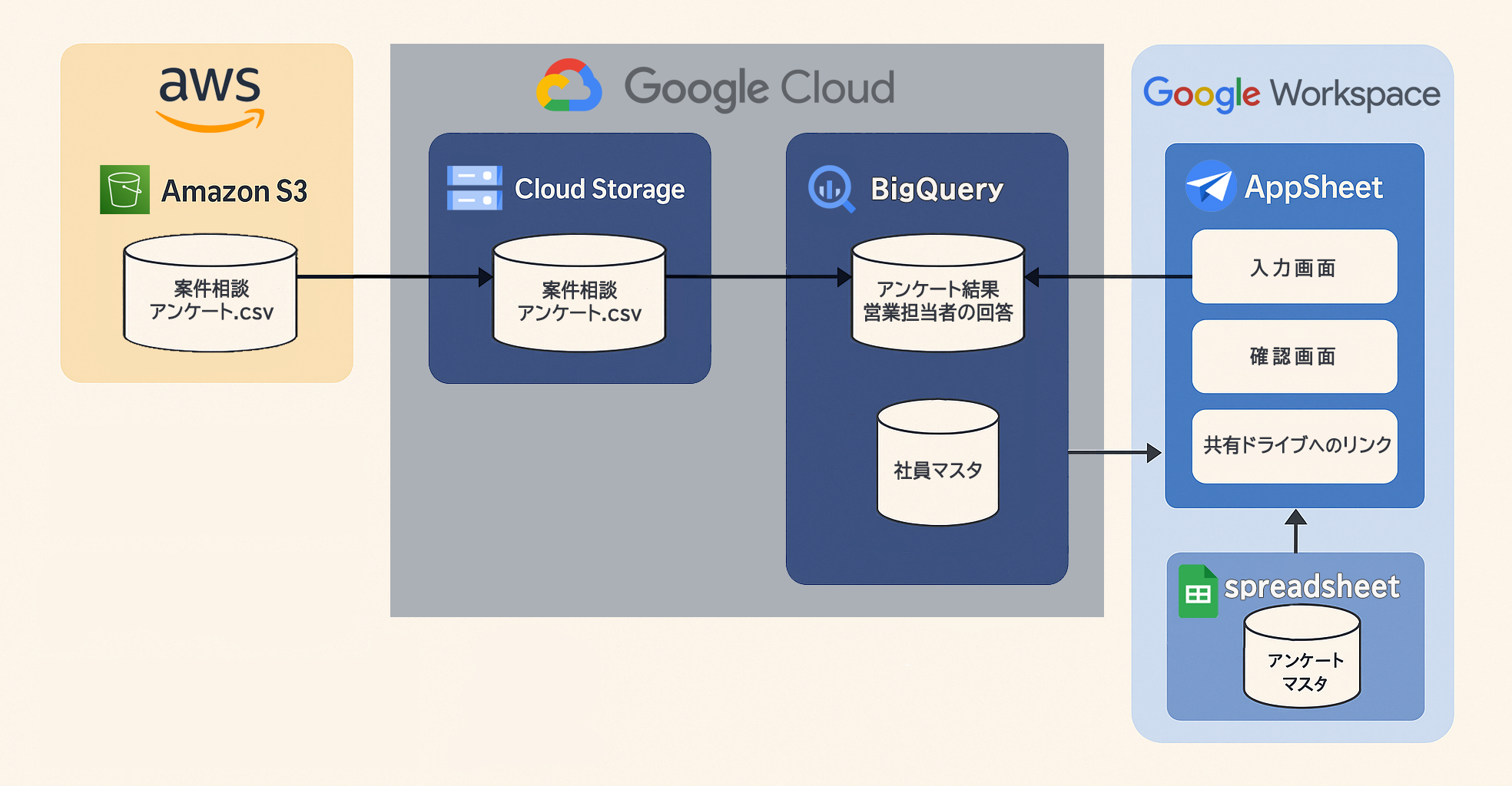 従来のAmazon Web Service(AWS)環境を活かしつつ、AppSheetとの連携を考慮し、そこから得られるデータをGoogle CloudのCloud StorageとBigQueryへリアルタイムに連携。これにより、AppSheetからのスムーズなデータ参照に加え、他のGoogle サービスとの連携やデータ分析も容易に実現。