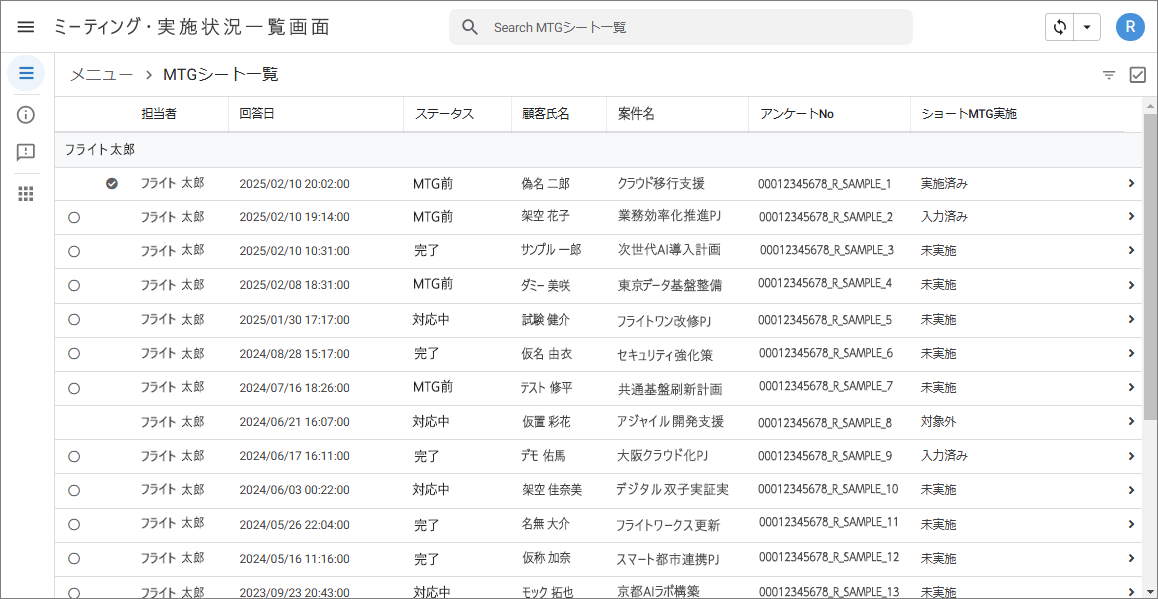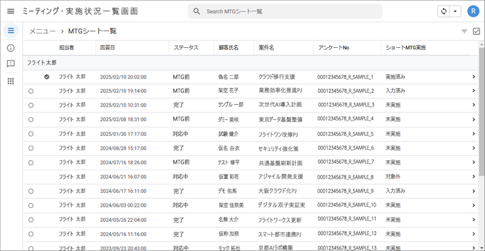 一覧画⾯内のMTGシート⼀覧を押すと、案件ごとのミーティング実施状況や議事内容が⼀覧表で⽴ち上がります。進捗がリアルタイムで可視化されるため、管理職は各担当者の活動状況を正確に把握し、適切なフォローや指⽰出しをタイムリーに⾏うことが可能になります。