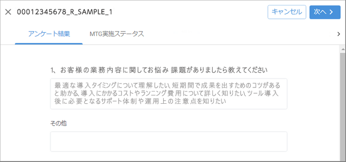アンケート回答詳細画⾯では、お客様からいただいた案件アンケートの回答詳細や営業の⽅の対応内容をいつでも確認できます。お客様のニーズや状況を事前に把握することで、初動のミーティングをより効果的に進めるための重要な情報として活⽤いただけます。