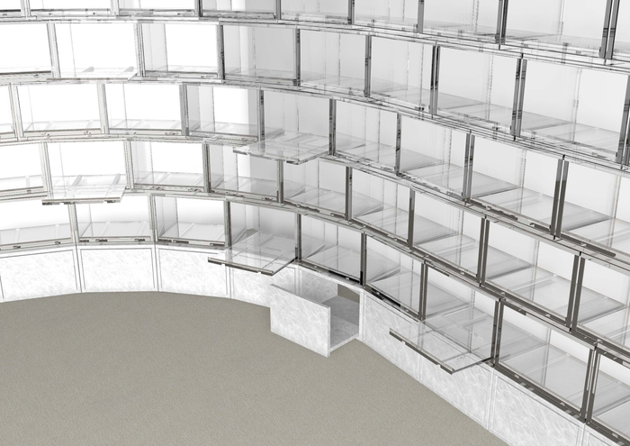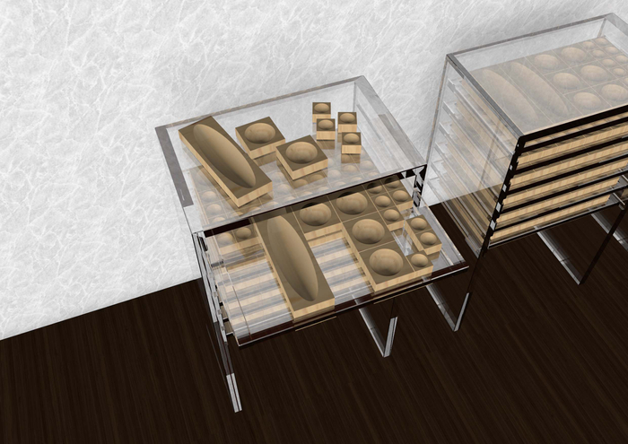 その際に開発した壁面大型展示ケースの大型ガラスの開閉方法をインテリアに転用
