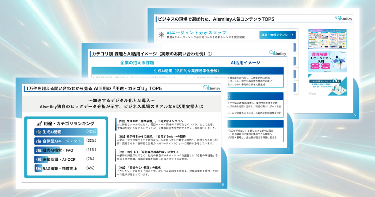 本資料は、最新の業界トレンド解説に加え、AIsmileyに日々寄せられる膨大な問い合わせデータをもとに、企業が今まさに直面している「リアルな課題」と、それに対する「具体的な解決策」を可視化した実務直結型のレポートです。