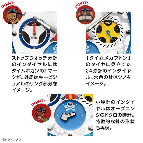 ストップウオッチ分針のインダイヤルには、タイムボカンのTマークをデザイン。