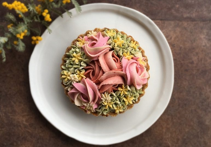 こちらの“チーズ風味のFlower Rawタルト”は今回初の《丹波篠山近又×sun rice kitchen》のコラボで実現した、花束のようなケーキです。
