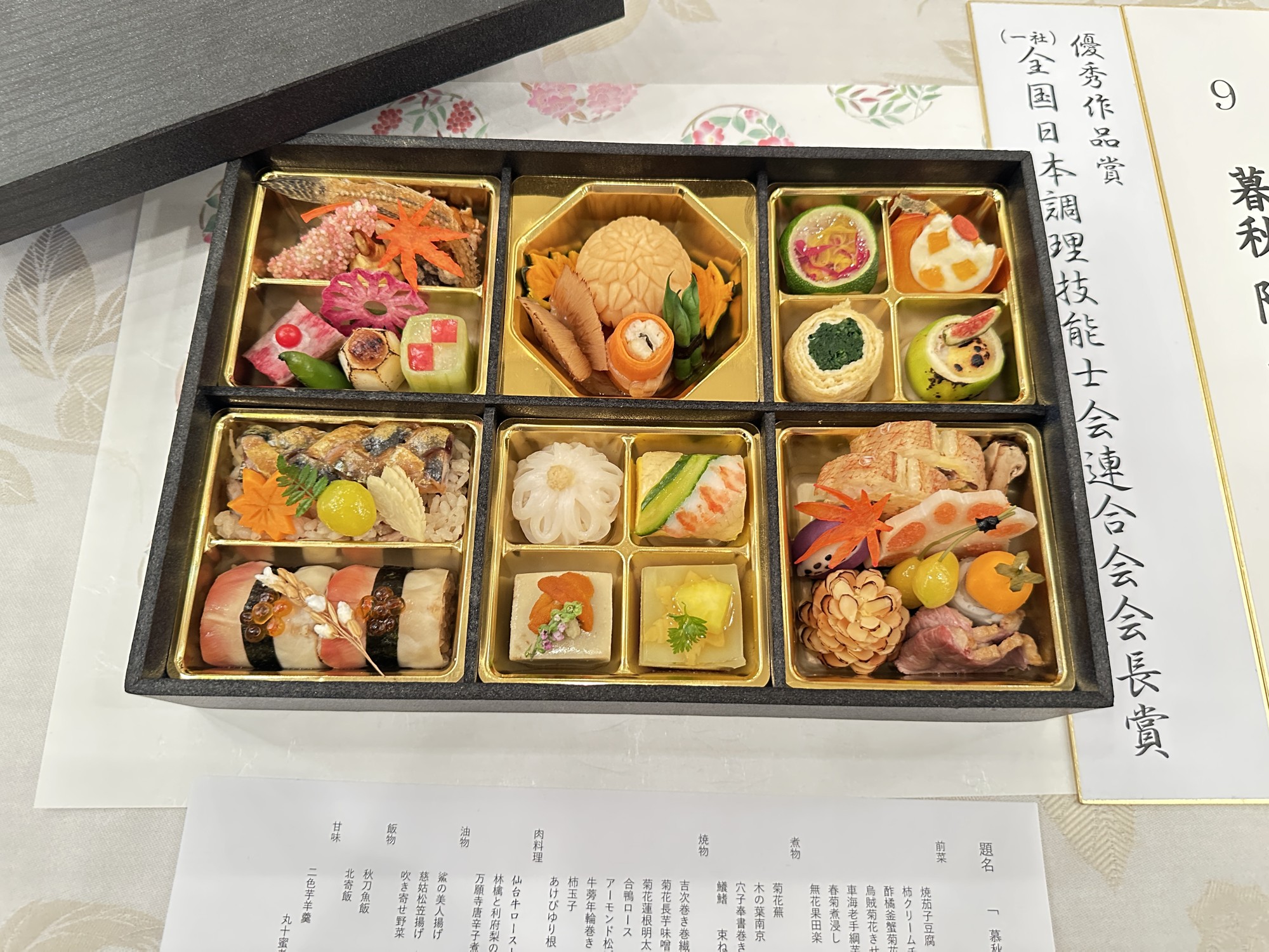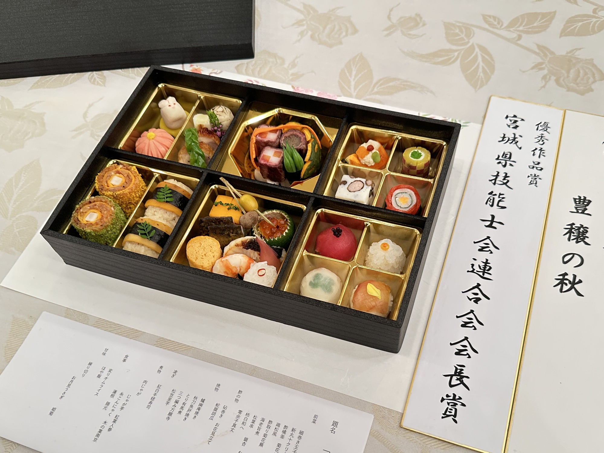 宮城県は海と山に囲まれ、新鮮な魚介類、野菜、肉類など多彩で豊富な食材に恵まれ「食材王国みやぎ」と呼ばれています。出展者は六つ切りの弁当箱(30cm×20cm)を用いて、宮城の秋の食材を使ったお弁当を彩り豊かに仕上げました。