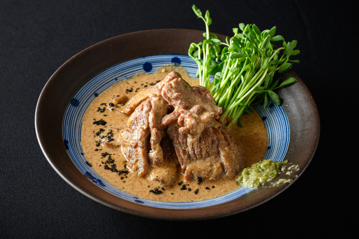 開発を進めている「牛肉の柚子みそごまだれ煮込み」は「もつ鍋」と同様、煮込み料理の系譜に連なるメニューとなります。使用している牛肉はハラミと呼ばれる部位で、モツなどと同様に内臓系に分類されます。脂が少なく、やわらかい食感が楽しめることが特徴です。ハラミを柚子みそごまだれで煮込んで味付けしました。味噌ベースのタレで煮込むことにより、「やま中」の看板メニューみそ味の「もつ鍋」との相性もよく、新たなみそ味の煮込み料理という魅力を伝えるメニューと位置付けています。柚子みそごまだれはベースとなる味噌だれにごまの香りが感じられるとともに、隠し味に柚子をアクセントに効かせました。見た目はみそとごまだれの印象が強いですが、口の中で柚子が香りが広がる味付けです。