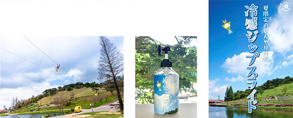 体験希望の方は、ロングジップスライドの受付に設置している冷感ミストをセルフでつけていただき、大きく手足を開いて全身で風を受け止めれば、冷感ミストによって爽快感を感じることができます。