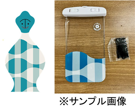 水上アスレチックで身軽にアスレチックを楽しみたい方には必須の防水ケースが新登場します。水上アスレチックのキャラクター「ワンダーアメンボー」の模様をあしらった、グリーニアオリジナルデザインです。