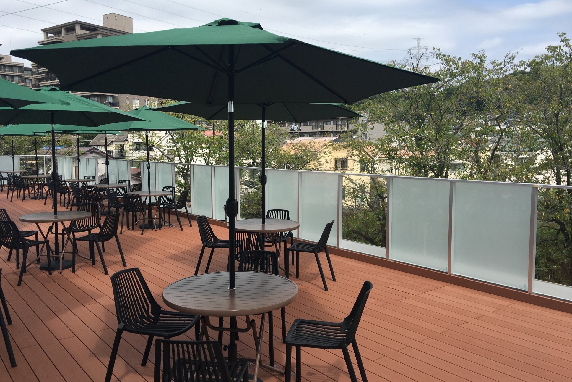 市民交流スペース2階にテラスを設けています。春には隣接する恩田川沿いの桜並木を眺めながら人々が集うことができるエリアで、カフェ「loop Ondagawa」メニューのご飲食も可能です(※ただし、学校給食メニューは対象外)。