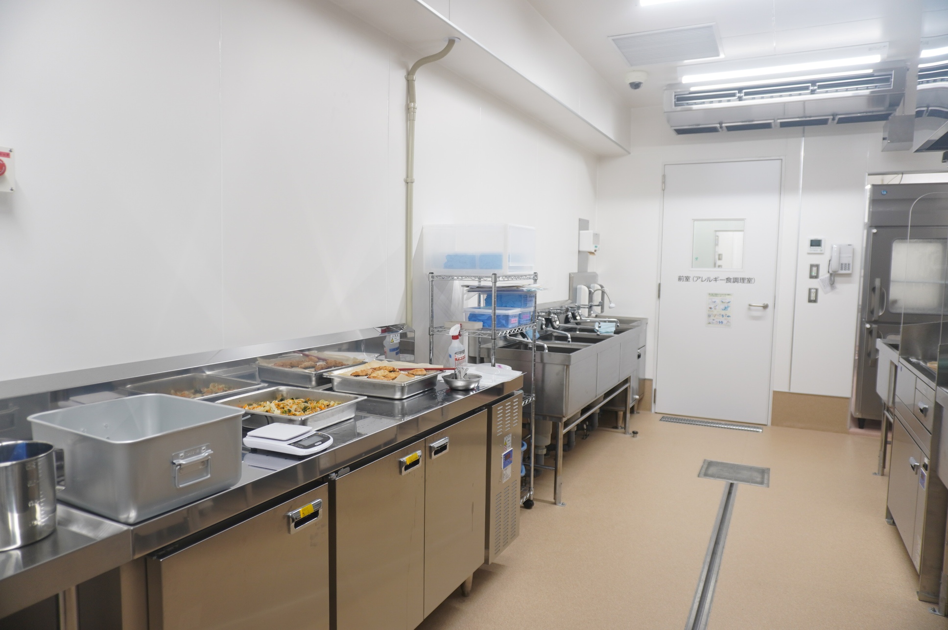 床を乾いた状態に保つドライシステムを導入するほか、センター内の汚染区域(荷受、下処理、洗浄室等)と非汚染区域(調理、コンテナ室等)を分け、さらに食材や調理員の動線をワンウェイ化します。また、設計段階からHACCPに対応した最新鋭の設備を導入するほか、SDHが培ってきた独自の衛生管理手法も加え、「安心・安全」を徹底します。また、検品、食材保管から下処理、調理、盛り付けまで一括作業できる食物アレルギー食等対応室を設置。1日最大40食まで調理可能です。