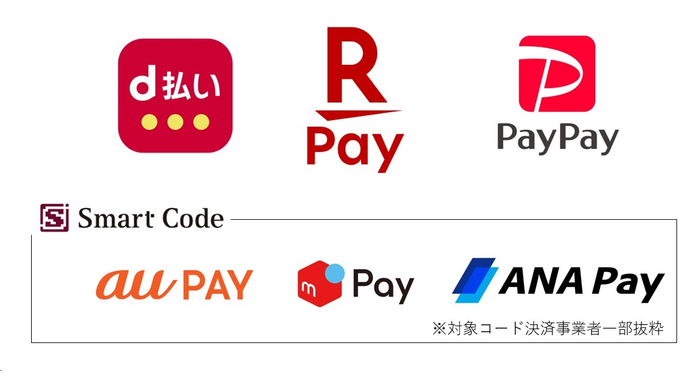 「PayPay」「楽天ペイ」「d払い®」に加えて、Smart Code™に対応する「au PAY」「メルペイ」「ANA Pay」などの決済手段がご利用できます。コード決済を導入することで、お客様により速く、安全で便利な購買体験を提供してまいります。
