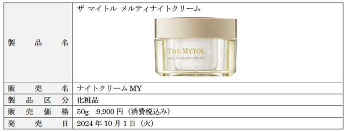 大正製薬株式会社[本社:東京都豊島区 社長:上原 茂](以下、当社)は、エイジングケア※1ブランド「THE MYTOL(ザ マイトル)」から、夜眠っている間にうるおいをいきわたらせ※2、ハリとつやのある肌に整える夜用クリーム『ザ マイトル メルティナイトクリーム』を、10月1日(火)より当社通販サイトTAISHO BEAUTY ONLINEにて発売いたします。