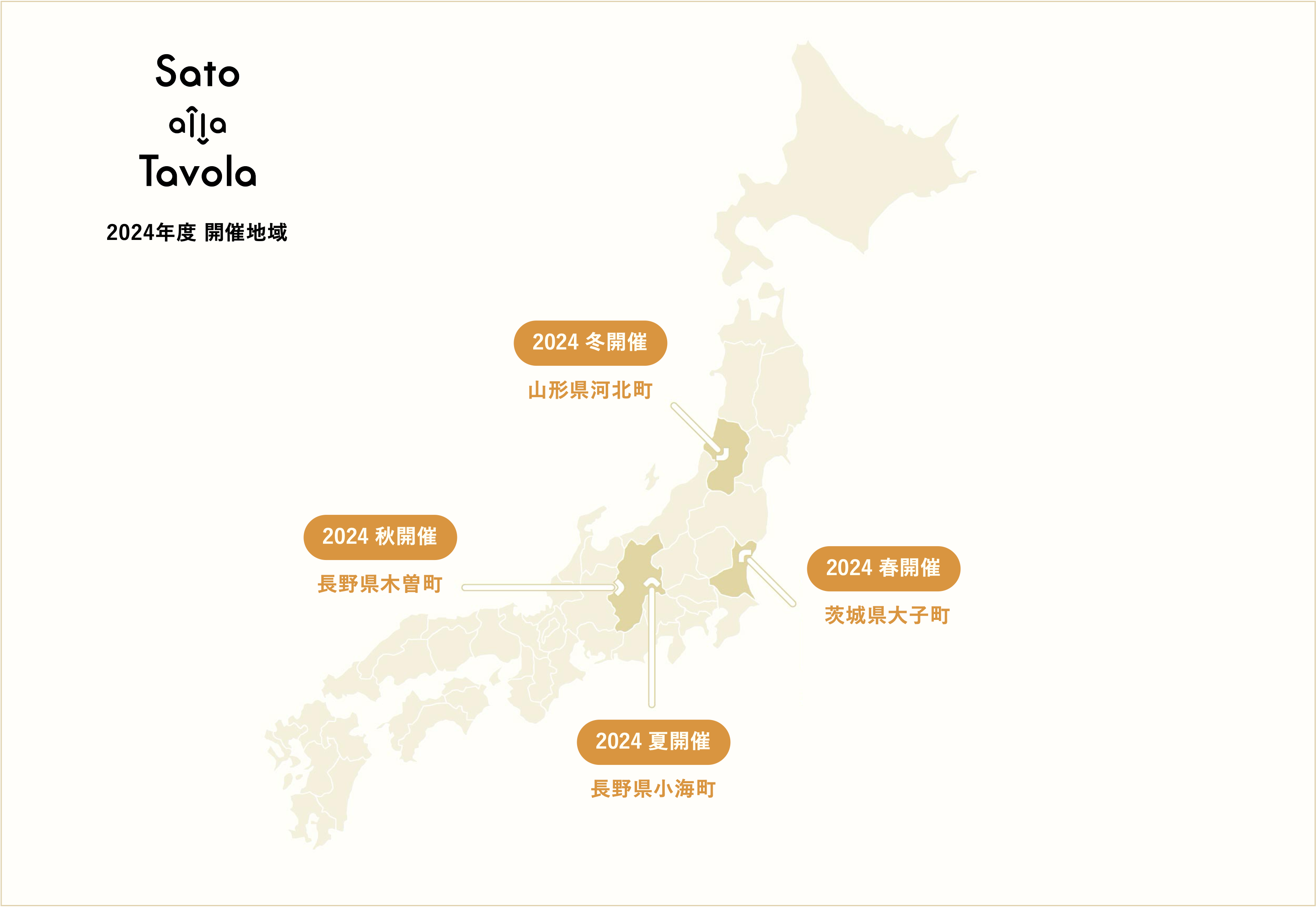 さとタボラでは、プロジェクトチームが実際に地域に足を運び、そこでお会いしたつくり手の方々の想いや食材に関するストーリーを見つけ、食事やイベント、読み物としてプロデュースします。今年度は、以下の4つの地域を巡る予定です。