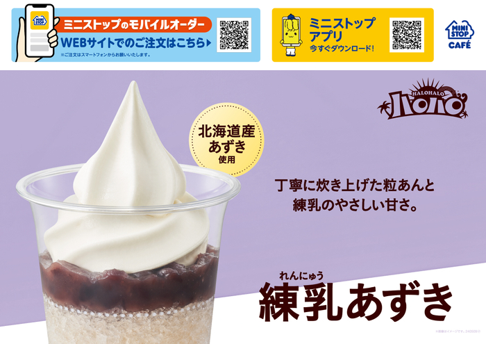 ●商品特長: 丁寧に炊き上げた北海道産あずき使用の粒あんに、練乳入りシロップをかけたかき氷、自慢のソフトクリームバニラを組み合わせました。何度でも食べたくなる美味しさの、「和」のハロハロ」です。