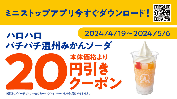 ミニストップアプリでは、対象のハロハロ「温州みかんソーダ」「練乳あずき」「ラムネ」の、20円引きクーポンを配信します。クーポンご利用には、ミニストップアプリのご登録、クーポン取得・提示が必要です。