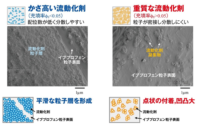 図2.流動化剤のかさ高さとイブプロフェン粒子表面の被覆状態の違い