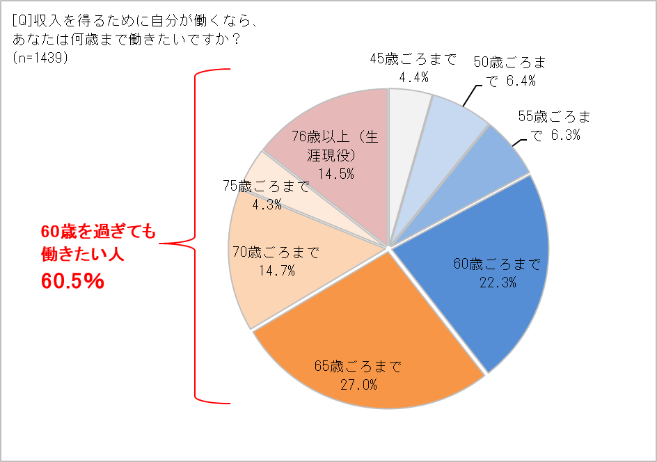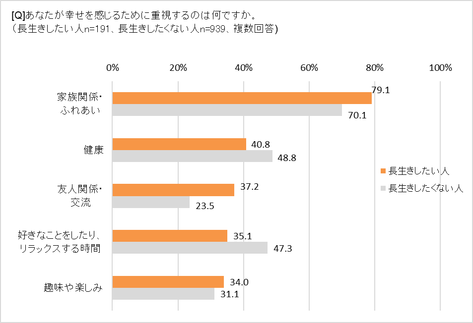 いっぽうで、「100歳まで長生きしたい」と回答した人が、幸せを感じるために重視していることベスト3は、1位「家族」79.1%、2位「健康」40.8%、3位「友人」37.2%。長生きしたくないと回答した人の集計結果と比べ、「家族」は9ポイント以上、「友人」は13ポイント以上高くなっています。また、60歳を過ぎても働きたいという人も60.4%に上り、「76歳以上(生涯現役)」も14.5%いました。働きたい理由としては、経済的な安定を求めつつも、「年齢を問わず、同僚と交流していたい」(40代・フリーランス)、「保育の仕事の経験を生かして、保育園や幼稚園などで役に立ちたい」(60代・パート)といった回答が寄せられ、人とのつながりを重視し、誰かの役に立ちたいと感じている声も目立ちました。
