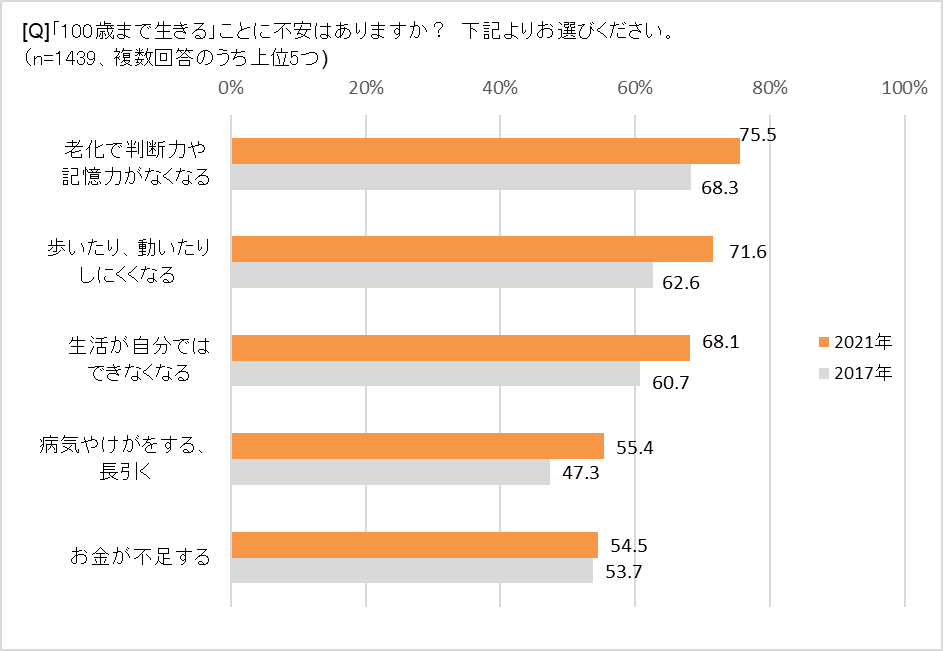 それでは100歳まで生きることへの不安、それは具体的にどのようなことでしょうか。上位は、「老化で判断力や記憶力がなくなる」75.5%、「歩いたり、動いたりしにくくなる」71.6%、「生活が自分ではできなくなる」68.1%など、健康に関する不安がずらり。しかも、2017年の調査から軒並み5~8ポイント増えています。「お金が不足する」54.5%は2017年とほぼ同数であることからも、経済的な不安より健康面の不安をより強く感じている傾向があるようです。背景としては、コロナ禍で「健康意識が変化した」という人が約6割もいることから、コロナ禍をきっかけに老後の健康不安をより強く感じるようになった人が少なくないことが推測されます。また、「みんなが目指す100歳像」の回答では、「自立」「自分でできる」という言葉が頻出。「自分のことは自分で行い、少しでもだれかの役に立てたらいいな」(50代・フルタイム)のように、いくつになっても自ら体を動かし、日常生活を楽しみたいと思っている人が多いと言えるでしょう。