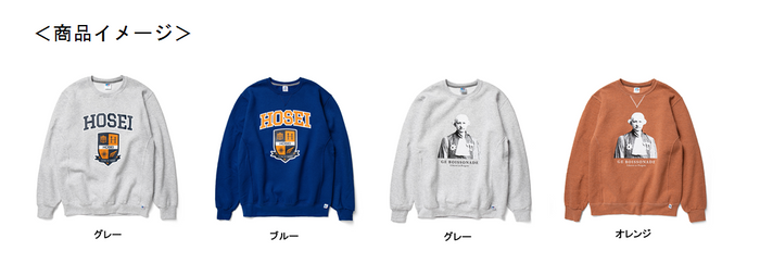 商品は、アメリカの大学のロゴスウェットを多数制作しているブランド「Russell Athletic」のスウェットを使用しています。王道のカレッジロゴデザインと大学のエンブレムをプリントしたスウェット(グレー・ブルー)と、法政大学の学生には馴染みのある「ボアソナード博士」(明治16年に法政大学の前身である東京法学校の教頭に就任)をイラストにしたスウェット(グレー・オレンジ)の2型・各2色を展開します。