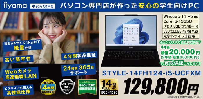 パソコン専門店が作った安心の学生向けノートPC「iiyama キャンパスPC」を2月1日より販売開始!学生期間を通して安心して使える4年間保証や最低買取保証が付属、更に物損保証付きモデルも選択可能