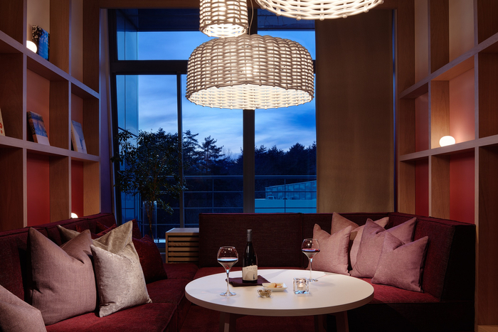 宿泊するのは、2階にある大きな窓からメインストリート「ピーマン通り」を望むメゾネットタイプのスイートルームです。1階には雄大な八ヶ岳連峰が描かれた壁紙が特徴的な寝室、2階にはローソファで寛げるリビングがあり、インテリアは落ち着いたボルドーカラーを基調にコーディネートしています。山梨県・長野県を代表する発酵食品「ワイン」を楽しめるように、ハーフボトルやソムリエおすすめの季節のワインが入ったワインセラー、3種類のワイングラスやデキャンタ、ワインの醸造過程で得た葡萄の搾りかすを染料にした「ワインレザー」のアイテムに、ワインや旅にまつわる書籍もあり、お部屋でも「発酵」に触れることができます。
