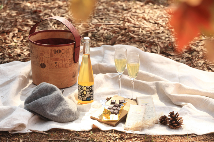 持ち運び可能なコルク素材の「VINO(ヴィノ) BAG(バッグ)」に「発酵アペリティフ」を用意します。りんごを発酵させたお酒「シードル(シクロヴィンヤード シードル/496ワイナリー・長野県東御市)」のウェルカムドリンクと、原産地で発酵されたカカオ豆を独自の製法(Bean to Bar チョコレート)で加工する「ダンデライオン・チョコレート」のセットです。シードル独特のパンのような香りとチョコレートのクランベリーのような甘味が絶妙なマリアージュを楽しめます。ディナーの前に、客室で日常の疲れを癒しながら、または敷地内の森で心地よい秋風を感じながら楽しむのもおすすめです。